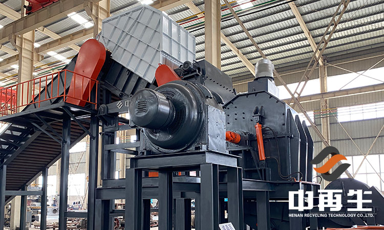 破碎線主機殼體采用特厚鋼板制造,內襯為高錳鑄鋼件,可更換;主機轉子盤安裝于水平軸上,轉子盤圓周分布有銷軸,軸向懸有錘頭;主軸用滾珠軸承支撐,循環油強制潤滑冷卻,并裝有溫度傳感器;進料口裝有液壓輥筒喂料裝置,位置一高一低,同向旋轉,能將大件松散物料壓扁,送入破碎腔內。
